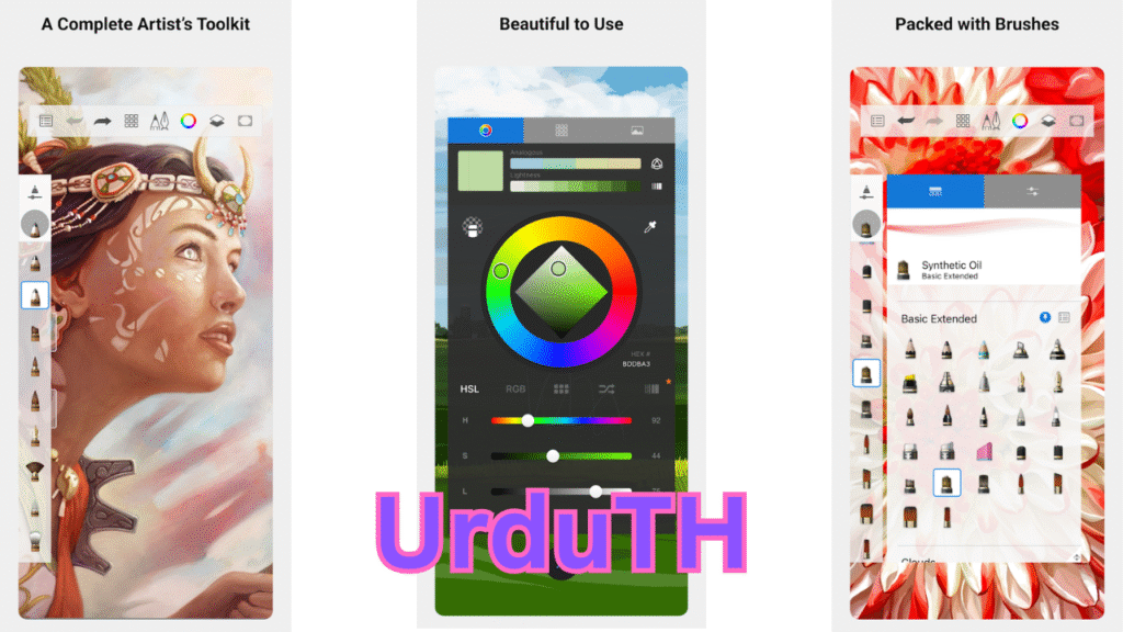 - برشز آزمائیں: بائیں جانب برش مینو سے مختلف قلم اور برشز منتخب کر کے ڈرائنگ شروع کریں۔